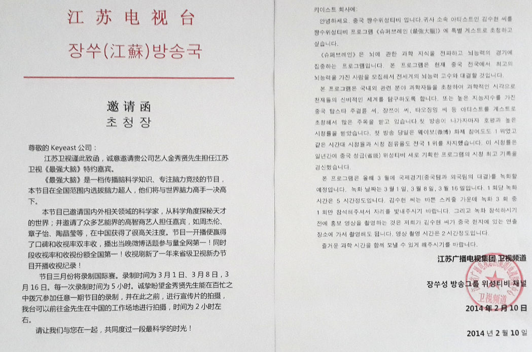 記者在這番邀請函上看到,《最強(qiáng)大腦》節(jié)目將于三月將錄制國際賽,錄制時間為3月1日、3月8日、3月16日,每一次錄制時間為5小時。如果此次邀請最終促成,金秀賢將參加其中一場節(jié)目的錄制。