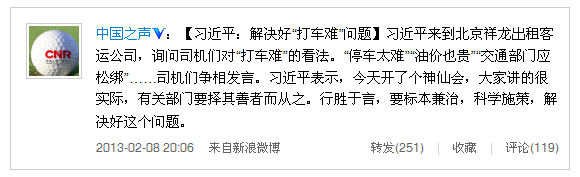【習(xí)近平:解決好“打車難”問題】習(xí)近平來到北京祥龍出租客運(yùn)公司,詢問司機(jī)們對(duì)“打車難”的看法?!巴\囂y”“油價(jià)也貴”“交通部門應(yīng)松綁”……司機(jī)們爭(zhēng)相發(fā)言。習(xí)近平表示,今天開了個(gè)神仙會(huì),大家講的很實(shí)際,有關(guān)部門要擇其善者而從之。行勝于言,要標(biāo)本兼治,科學(xué)施策,解決好這個(gè)問題。