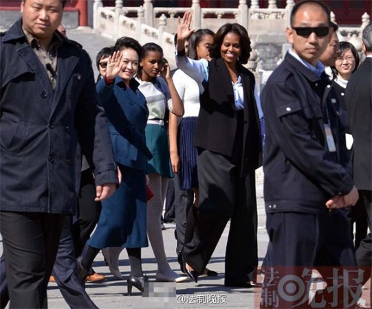 3月21日上午,美國總統(tǒng)夫人米歇爾參觀故宮,彭麗媛陪同。彭麗媛一身湖藍(lán)色裙裝,米歇爾黑白色職業(yè)裝扮,兩個(gè)女兒穿著清爽的休閑裙裝。
