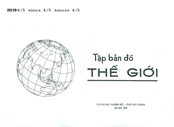 1972年5月越南總理府測量和繪圖局印制的《世界地圖集》,用中國名稱標(biāo)注西沙群島(見附件4)。1974年越南教育出版社出版的普通學(xué)校九年級(jí)《地理》教科書,在《中華人民共和國》一課(見附件5)中寫道:“從南沙、西沙各島到海南島、臺(tái)灣島、澎湖列島、舟山群島,……這些島呈弓形狀,構(gòu)成了保衛(wèi)中國大陸的一座‘長城’。”