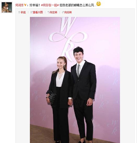 ‘何你在一起’但我老婆的眼睛怎么那么鳳……”照片中,何潤東老婆身材高挑纖瘦,扎著高高的馬尾,兩人身穿情侶黑色套裝,甜蜜的手牽手,幸福之意溢于言表,另外是夫妻倆合影林心如的照片,林心如一襲露肩白色長裙,何潤東和老婆分別站在林心如兩側.