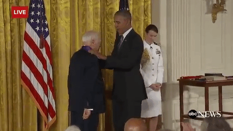 據(jù)報道,老藝術(shù)家Mel Brooks今天進白宮接受“National Medal of Arts”,奧巴馬往他脖子上掛獎章的時候,這個90歲的老頑童做勢要脫奧巴馬的褲子,給總統(tǒng)嚇了一趔趄。
