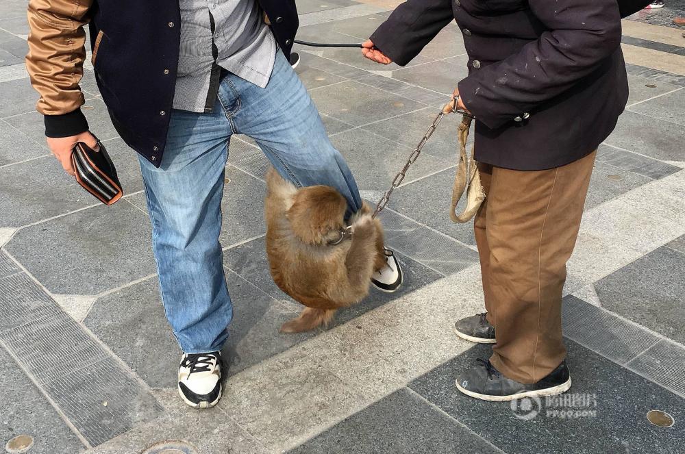 2016年12月11日,在合肥一公園門口,有幾只猴子在主人的指令下,緊緊抱住行人的腿部,幫主人討要1元“擁抱費(fèi)”,如對(duì)方不給則緊抱不放。馬方/視覺中國(guó)