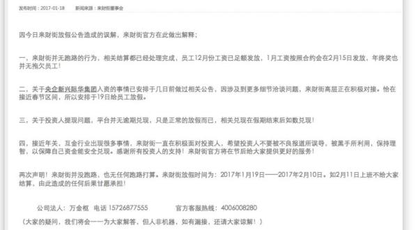 上述公告發(fā)布之后引起了投資者和員工的強(qiáng)烈不滿,于是來財(cái)街官網(wǎng)數(shù)小時(shí)后又發(fā)布了聲明,強(qiáng)調(diào)“來財(cái)街并無跑路的行為,相關(guān)結(jié)算都已經(jīng)處理完成,員工12月份工資已足額發(fā)放,1月工資按照合約會(huì)在2月15日發(fā)放,年終獎(jiǎng)也并無拖欠員工!”
