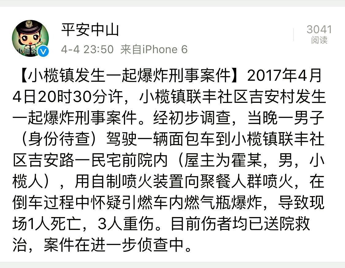 2017年4月4日20時30分許,小欖鎮(zhèn)聯(lián)豐社區(qū)吉安村發(fā)生一起爆炸刑事案件。經(jīng)初步調(diào)查,當(dāng)晚一男子(身份待查)駕駛一輛面包車到小欖鎮(zhèn)聯(lián)豐社區(qū)吉安路一民宅前院內(nèi)(屋主為霍某,男,小欖人),用自制噴火裝置向聚餐人群噴火,在倒車過程中懷疑引燃車內(nèi)燃?xì)馄勘?,?dǎo)致現(xiàn)場1人死亡,3人重傷。