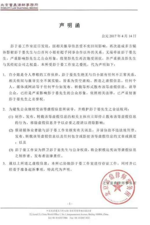 彭于晏方發(fā)聲明:與白百合絕無不正常關系