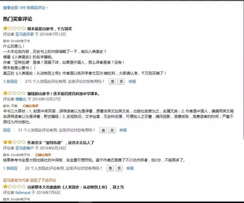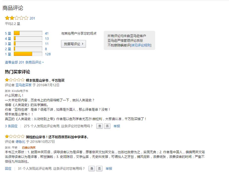 “我居然讀了一本假書。”在豆瓣,一位買到《人類簡史——我們?nèi)祟愡@些年》的讀者如此感慨。大量吐槽出現(xiàn)在豆瓣和亞馬遜等平臺,該書在豆瓣評分低至2.5分,并被打上了“山寨”字樣。