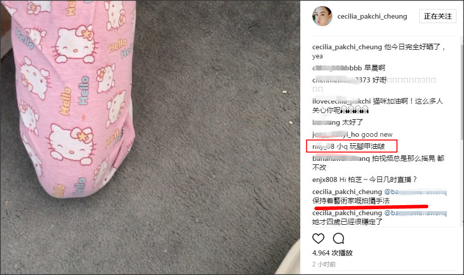 最后喂完貓后張柏芝拿起手機(jī)拍攝,這時候貓?zhí)搅诵的腳上。在鏡頭里面我們意外發(fā)現(xiàn)小Q的腳趾甲全部都涂了腳指甲油,而且顏色還是非常亮眼的粉紅色,看來小Q內(nèi)心保持著一顆少女心啦。