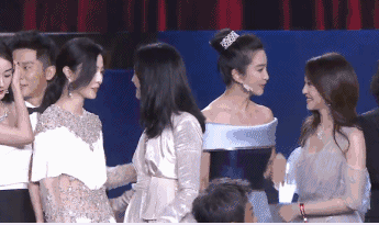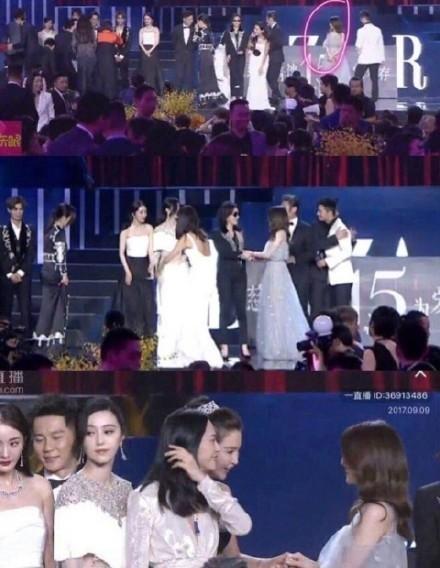 然后呢,大家都知道,雙冰是不會往一起站的,她們叫來了姚晨來破解這個尷尬。冰冰這是把大姚轉(zhuǎn)了一圈啊。