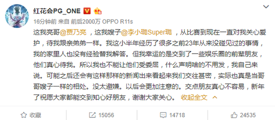 網(wǎng)易娛樂12月31日報(bào)道 今天早前,某媒體曝出李小璐夜宿PG ONE家,但同一時(shí)間賈乃亮卻在直播中說老婆李小璐正在做頭發(fā),引起網(wǎng)友猜疑。中午,PG ONE發(fā)微博澄清:不能讓他們受委屈。