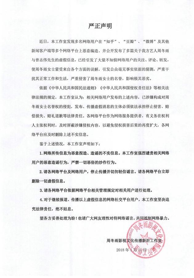 周冬雨工作室發(fā)布聲明