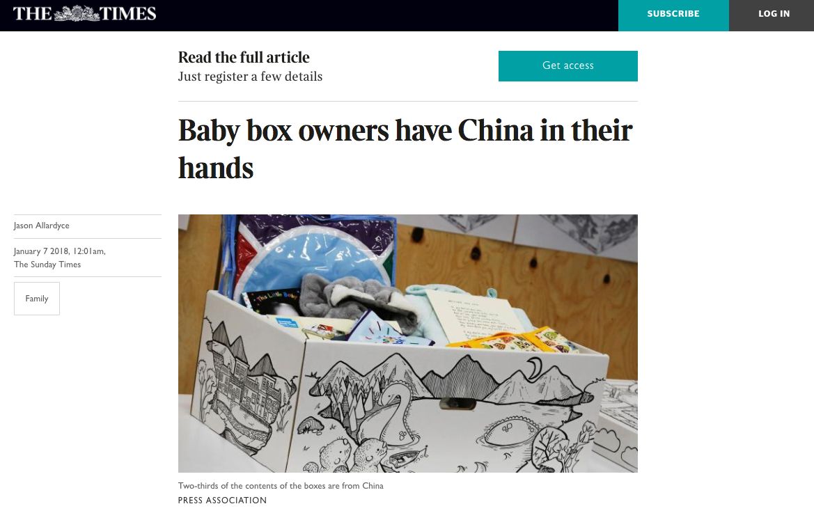 嬰兒箱里的嬰兒睡袋、背心、褲子、手套和帽子都是中國制造,甚至連圍嘴、浴巾、指甲銼和溫度計等一些物件也來自中國。盒子里只有毯子和毛巾是由歐洲制造的,產(chǎn)婦衛(wèi)生巾來自英國諾丁漢郡,而一本精裝書由倫敦出版。
