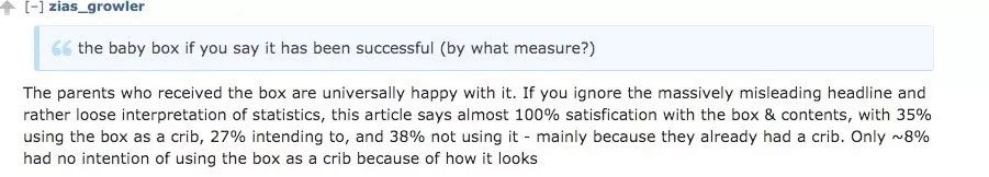 有網(wǎng)友說,“許多收到盒子的父母都很滿意,盒子里的東西可以給小寶寶用,而盒子本身還可以當成一個嬰兒床。”
