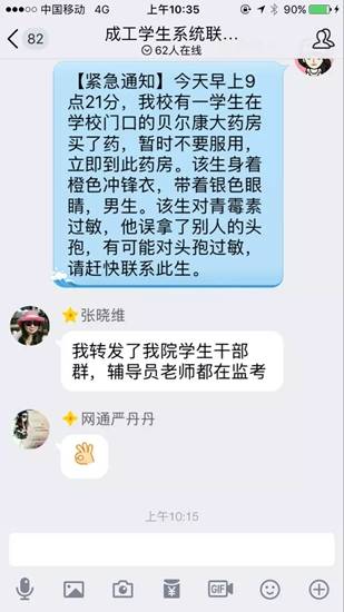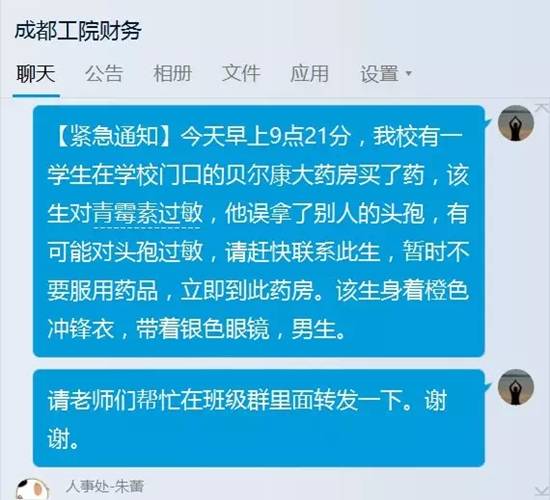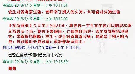 發(fā)布的消息內(nèi)容為:“【緊急通知】今早上9點(diǎn)21分,我校有一學(xué)生在學(xué)校門口的貝爾康大藥房買了藥,該生對青霉素過敏,他誤拿了別人的頭孢,有可能對頭孢過敏,請趕快聯(lián)系此生,暫時不要服用藥品,立即到此藥房。該生身著橙色沖鋒衣,戴銀色眼鏡,男生。”