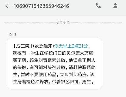 15日上午10時03分,成都工業(yè)學(xué)院接到了校門口一藥房的求助:一名戴銀色眼鏡,身著橙色沖鋒衣的學(xué)生在結(jié)賬時誤拿了別人頭孢藥,因其告訴工作人員對青霉素過敏,如服用將可能產(chǎn)生嚴(yán)重后果。