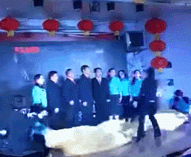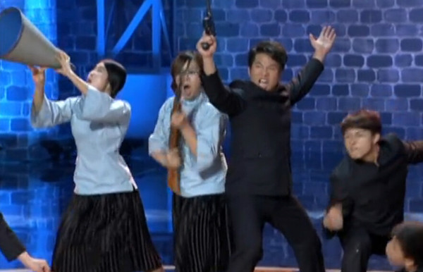 節(jié)目中參賽選手伴著《黃河大合唱》的背景音樂,做出一些夸張另類的肢體動作,當時這段表演引得現(xiàn)場四位評委大笑,并獲得全票通過。