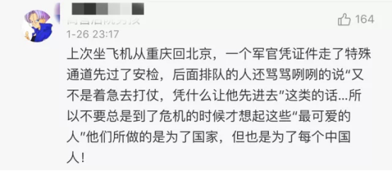 有網(wǎng)友就指出,在機場安檢口,一位軍人憑證件走軍人優(yōu)先窗口,卻有乘客罵罵咧咧地說:“又不是著急去打仗,憑什么讓他先進去?”