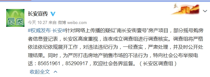 長(zhǎng)安區(qū)委宣傳部表示,針對(duì)網(wǎng)絡(luò)上傳播的疑似“南長(zhǎng)安街壹號(hào)”房產(chǎn)項(xiàng)目,部分搖號(hào)購(gòu)房者信息登記表,長(zhǎng)安區(qū)高度重視,連夜成立調(diào)查組進(jìn)行調(diào)查核實(shí)。調(diào)查組將嚴(yán)格依法依紀(jì)依規(guī)展開(kāi)工作,對(duì)違法違紀(jì)行為,一經(jīng)查實(shí),嚴(yán)肅處理,并及時(shí)公開(kāi)處理結(jié)果。同時(shí),為嚴(yán)厲打擊房地產(chǎn)銷(xiāo)售市場(chǎng)的不法行為,特向社會(huì)公布舉報(bào)電話:85651961,85290917,歡迎社會(huì)各界監(jiān)督。