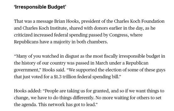 另外,科赫兄弟還表示他們不會(huì)再向以前那樣輕易支持共和黨的議員了,因?yàn)檫@些議員并沒有履行他們競(jìng)選時(shí)的承諾,反而是一直在支持美國政府的一些違背市場(chǎng)的政策,比如在今年3月的一項(xiàng)加大政府財(cái)政開支的法案。