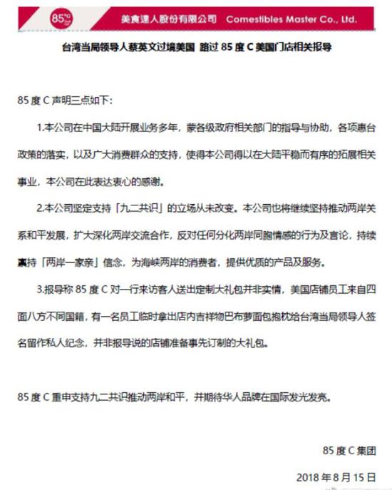 目前,針對蔡英文“訪問”其美國店面而引起了強(qiáng)烈輿論風(fēng)波,“85度C”剛剛在其開設(shè)在大陸微博和微信平臺(tái)的賬號(hào)上發(fā)布了一則聲明,強(qiáng)調(diào)其支持“九二共識(shí)”和“反對任何分化兩岸同胞情感的行為及言論”。