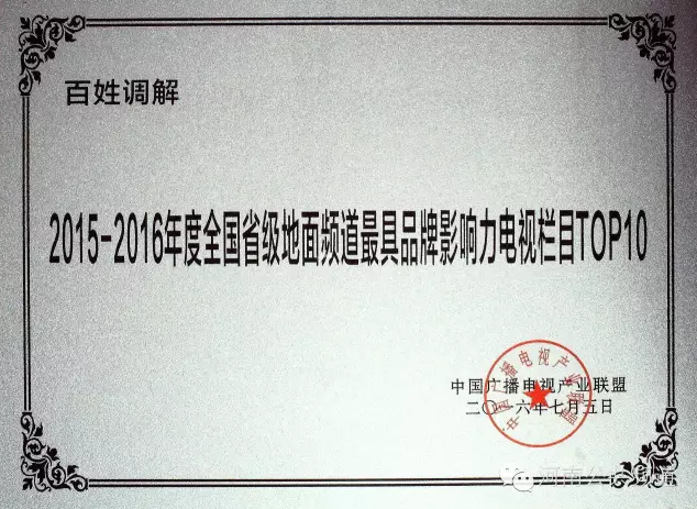 《百姓調(diào)解》欄目榮獲2015-2016年度全國省級地面頻道最具品牌影響力電視欄目TOP10。