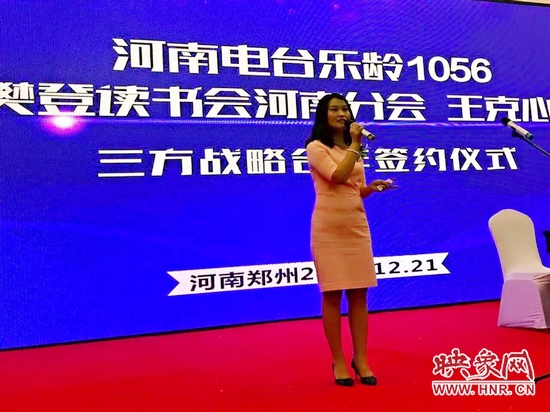 在河南電臺(tái)樂(lè)齡1056“說(shuō)說(shuō)心理話”主持人文聰?shù)闹鞒窒拢幽想娕_(tái)信息廣播總監(jiān)助理沈建波、樊登讀書(shū)會(huì)河南分會(huì)會(huì)長(zhǎng)程海濤、王克心理創(chuàng)始人王克共同簽約了三方合作協(xié)議。