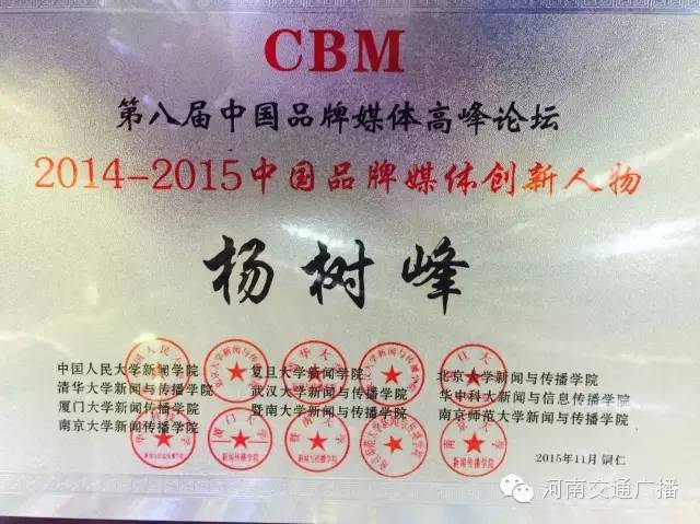 本屆論壇上,河南交通廣播總監(jiān)楊樹(shù)峰榮獲2014-2015中國(guó)品牌媒體創(chuàng)新人物稱(chēng)號(hào),這是對(duì)他個(gè)人成就的肯定,更體現(xiàn)了河南交通廣播運(yùn)管機(jī)制的成功,人文關(guān)懷、扁平化管理,民主決策、智慧碰撞,從決策層發(fā)出的指令,成為掌控河南交通廣播精準(zhǔn)運(yùn)行,走向成功的靈魂,而我們一切的努力,都是為了實(shí)現(xiàn)一個(gè)目標(biāo):無(wú)論何時(shí)、何地,無(wú)論現(xiàn)在、未來(lái),伴你出行每一刻。