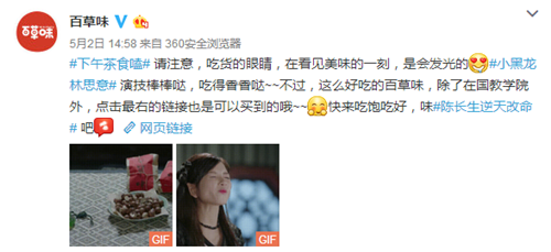 當大多數品牌滿足于在電視劇中露下臉的時候,百草味已經開始融入劇情。令人驚訝的是,露臉的惹人嫌,大篇幅講述“名字來源”的百草味,竟然收獲一眾好評。