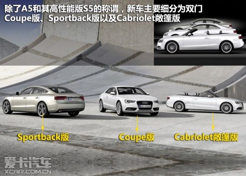 2012款奧迪A5屬于中期改款車型,在外觀、內飾、動力和底盤上都有較為明顯的變化。除了A5和其高性能版S5的稱謂,新車主要細分為雙門Coupe版、Sportback版以及Cabriolet敞篷版。