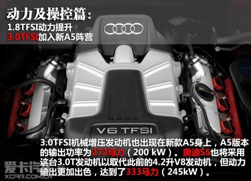 入門級的奧迪A5將采用1.8TFSI發(fā)動機(jī),重新調(diào)教后,動力輸出從158馬力提高到168馬力。2.0 TFSI發(fā)動機(jī)的動力輸出依舊為211馬力(155kW)。3.0TFSI機(jī)械增壓發(fā)動機(jī)也出現(xiàn)在新款A(yù)5身上,A5版本的輸出功率為272馬力(200 kW)。奧迪S5也將采用這臺3.0T發(fā)動機(jī)以取代此前的4.2升V8發(fā)動機(jī),但動力輸出更加出色,達(dá)到了333馬力(245kW)。變速箱方面,與以上幾款發(fā)動機(jī)匹配的將有6速手動、無級變速器、7速S tronic三種。