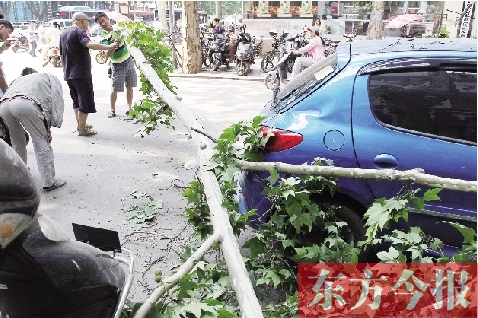 原來,當(dāng)天下午1點(diǎn)25分,張先生和朋友一起吃飯,將自己的標(biāo)致207轎車停在了鄭州市靠近文化路的緯一路上,不料,幾分鐘后,一根長(zhǎng)約六米的樹枝從天而降,將他的車后窗玻璃砸爛,車身也被砸凹了。