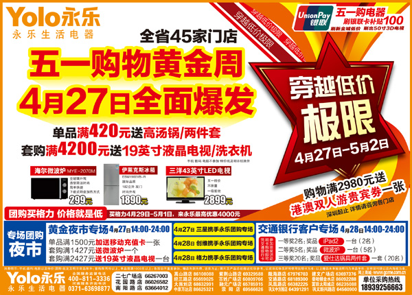 據悉,今年五一,永樂電器向中外800多家電器廠家拋出30億規(guī)模的采購大單。借助于30億大單的規(guī)模優(yōu)勢,永樂將于4月27日發(fā)起五一黃金周降價潮,其中,彩電產品全場7折起,50英寸3D彩電價格更是首次降價幅度超過25%,合資品牌46英寸LED網絡電視跌破7000元,合資品牌三洋32英寸液晶電視僅售1699元;空調方面,格力、美的、海爾、志高、伊萊克斯、TCL、三洋等知名空調廠商的2012主打產品五一期間全部上陣永樂各大賣場,舉行大型特賣活動,使空調價格下降25%左右。1匹空調永樂五一最低降至2000元以下,而且不限量供應,更驚爆的還有一款1.5P的空調僅售價1999元,且大量供應100臺;洗衣機價格平均降幅達30%,冰箱產品平均降幅也在30%以上,對開門冰箱首度跌破3500元。此外,廚衛(wèi)產品也將出現(xiàn)全年最大幅度的讓利優(yōu)惠,煙灶、熱水器等產品將以直降為主,購買套餐組合優(yōu)惠力度更大,方太經典歐式煙灶套餐僅3700元左右,華帝廚衛(wèi)全場5折起,伊萊克斯電熱水器驚爆價999元;暢銷小家電也將大幅優(yōu)惠讓利。3C產品優(yōu)惠力度更大。其中HTC、索尼愛立信、諾基亞等品牌新品、暢銷品超低價銷售,千元智能手機大量供應;數(shù)碼產品方面,佳能、索尼、尼康、奧林巴斯、三星等品牌全面低價讓利,降價幅度高達20%。1200萬數(shù)碼相機跌破700元。最熱門的佳能600D單反數(shù)碼僅售5287元另加送多重禮品;同時,電腦產品也有不同程度的優(yōu)惠,戴爾2G內存、500G硬盤、雙核處理器、獨立顯卡的筆記本電腦永樂專享價僅2999元。