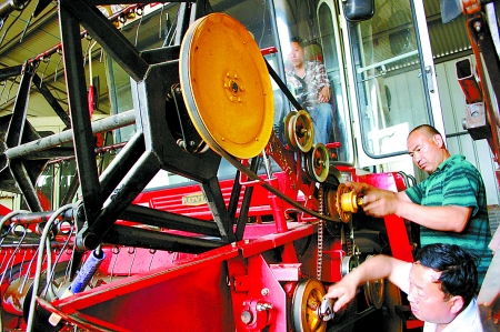 5月7日,武陟縣農(nóng)機(jī)局的技術(shù)人員正在幫助農(nóng)機(jī)手檢修小麥?zhǔn)崭顧C(jī)。“三夏”臨近,武陟縣農(nóng)機(jī)局組織技術(shù)人員深入鄉(xiāng)村,對(duì)全縣參加跨區(qū)作業(yè)的800多臺(tái)小麥聯(lián)合收割機(jī)進(jìn)行全面檢修,并對(duì)機(jī)手進(jìn)行安全操作技能培訓(xùn),做好參加跨區(qū)麥?zhǔn)铡皶?huì)戰(zhàn)”的準(zhǔn)備。 馮小敏 李福利 攝