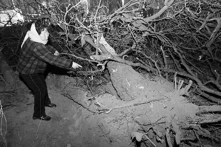 被毀的棗樹林位于新鄭市好想你棗業(yè)公司對(duì)面的新港大道路東。昨晚,記者趕到現(xiàn)場(chǎng),看到公路旁的楊樹已經(jīng)東倒西歪,穿過楊樹林走不遠(yuǎn),便是被毀的棗樹林。有的棗樹齊根折斷,有的被連根拔起,地上留下大大小小的土坑,一片狼藉。