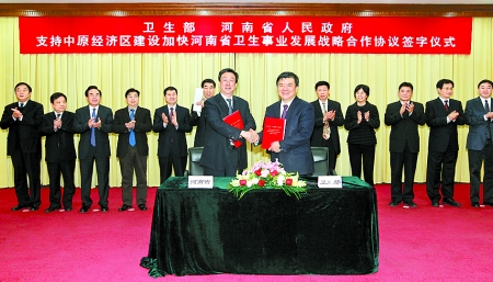 河南日?qǐng)?bào)訊 (記者屈 芳)河南衛(wèi)生事業(yè)迎來加快發(fā)展的新機(jī)遇。3月21日下午,衛(wèi)生部與河南省人民政府關(guān)于支持中原經(jīng)濟(jì)區(qū)建設(shè)加快河南省衛(wèi)生事業(yè)發(fā)展戰(zhàn)略合作協(xié)議簽字儀式在北京舉行,衛(wèi)生部部長(zhǎng)陳竺,省委副書記、省長(zhǎng)郭庚茂在簽字儀式上講話并代表雙方在合作協(xié)議上簽字。
