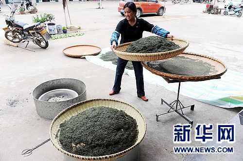4月10日,信陽市浉河區(qū)董家河鎮(zhèn)的農戶在晾曬烘烤茶葉。