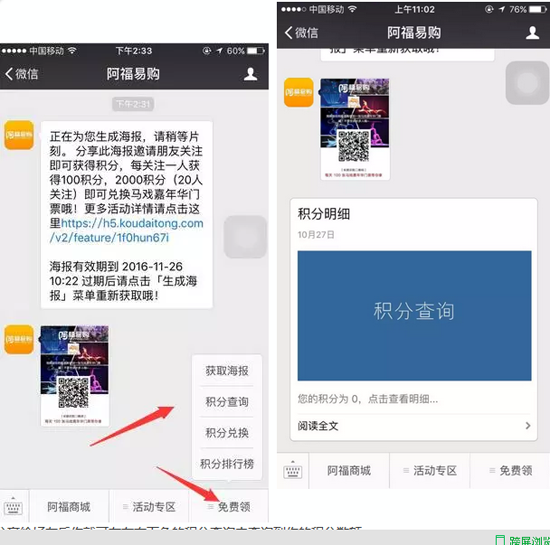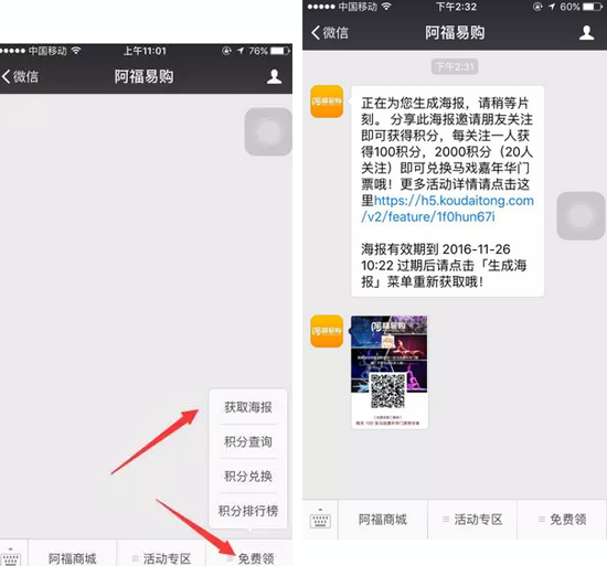 首先點(diǎn)擊右小角的免費(fèi)領(lǐng),然后點(diǎn)擊分享海報(bào),分享給好友關(guān)注阿福易購的微信公號(hào)就可獲得積分。一個(gè)好友一百個(gè)積分,20個(gè)好友就可獲得2千個(gè)積分就能兌換馬戲門票。