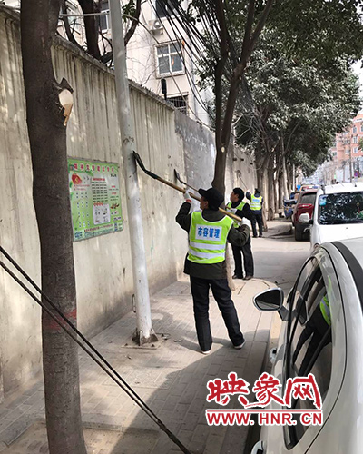 工作人員把丟在地上的廣告紙,拾起扔進(jìn)準(zhǔn)備好的垃圾袋;欄桿墻面上“頑固的小廣告”,先灑上水潤(rùn)濕,然后用小鏟逐一耐心鏟掉;對(duì)路面的灰塵、生活垃圾建筑垃圾等進(jìn)行現(xiàn)場(chǎng)打掃,集中清運(yùn);對(duì)散亂的纜線進(jìn)行整理固定,對(duì)裸露的黃土覆蓋上防塵網(wǎng),工作場(chǎng)面甚是壯觀。經(jīng)過3個(gè)小時(shí)的辛苦勞動(dòng),共清理垃圾5余車。