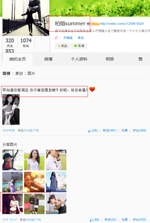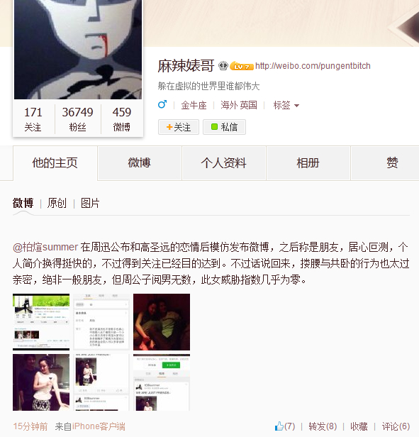 該微博也引起了不少熱心網(wǎng)友的注意,微博@麻辣婊哥懷疑@柏煊summer在刻意炒作,微博稱:“@柏煊summer 在周迅公布和高圣遠的戀情后模仿發(fā)布微博,之后稱是朋友,居心叵測,個人簡介換得挺快的,不過得到關注已經(jīng)目的達到。不過話說回來,摟腰與共臥的行為也太過親密,絕非一般朋友,但周公子閱男無數(shù),此女威脅指數(shù)幾乎為零。 ”