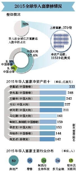 從行業(yè)分布看,華人富豪前十中,房地產(chǎn)巨頭依然占據(jù)最多席位。此外,2015年上榜的370位華人富豪中,房地產(chǎn)依舊牢牢占據(jù)著第一的位置,有80位、超過(guò)20%的華人富豪涉足房地產(chǎn)行業(yè)。其中,大連萬(wàn)達(dá)集團(tuán)董事長(zhǎng)王健林以凈資產(chǎn)242億美元躋身前三,也是大陸富豪第一位。(記者 梁薇薇)