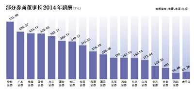 就券商董事長(zhǎng)薪酬來(lái)看,2014年薪酬超過(guò)400萬(wàn)的包括中信證券董事長(zhǎng)王東明,薪酬為531萬(wàn)元;廣發(fā)證券董事長(zhǎng)孫樹(shù)明438萬(wàn)元;華泰證券董事長(zhǎng)吳萬(wàn)善424萬(wàn)元;國(guó)信證券董事長(zhǎng)何如423萬(wàn)元。