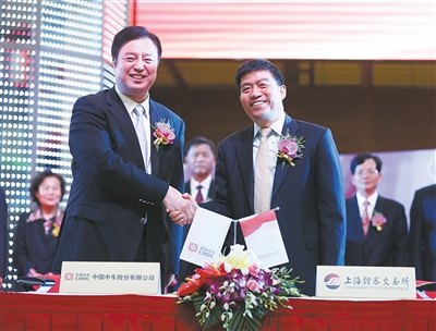 6月8日,中國中車股份有限公司副董事長劉化龍(左)與上海證券交易所副總經(jīng)理徐明簽訂《上市協(xié)議書》。當(dāng)日,中國中車在上交所鳴鑼上市。