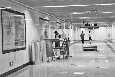 高溫之下,工人師傅正在進(jìn)站口處抓緊施工。