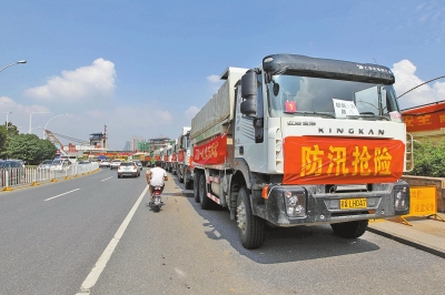 昨天,武漢市江漢區(qū)沿江大道,一排排渣土車滿載渣土,??吭诼愤叀iL江北岸的堤壩上,到處張貼著“人在堤在”、“誓死保衛(wèi)大武漢”等宣傳標語。