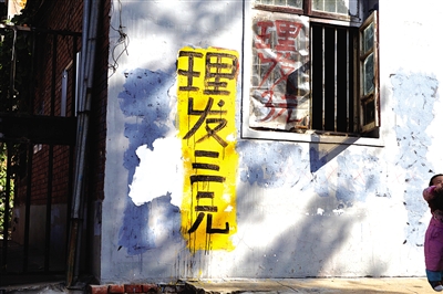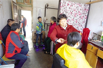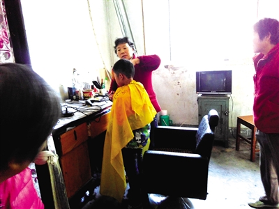 10月30日上午,在省紡機家屬院門口,老太太的理發(fā)店門外,黃色油漆寫的“理發(fā)三元”的牌子格外醒目,在一間不大的理發(fā)店內(nèi),除去老太太的一張木板床外就是理發(fā)的東西,屋內(nèi)緊挨門口的長凳上坐滿了前來理發(fā)的人們,有大人也有小孩,大家坐在那里一邊等著理發(fā),一邊互相閑聊著。老太太正在給一個十來歲的小男孩理發(fā),旁邊坐著小男孩的爺爺奶奶。一些附近的農(nóng)民工也不斷進來詢問老太太啥時候有空給他們理發(fā)。