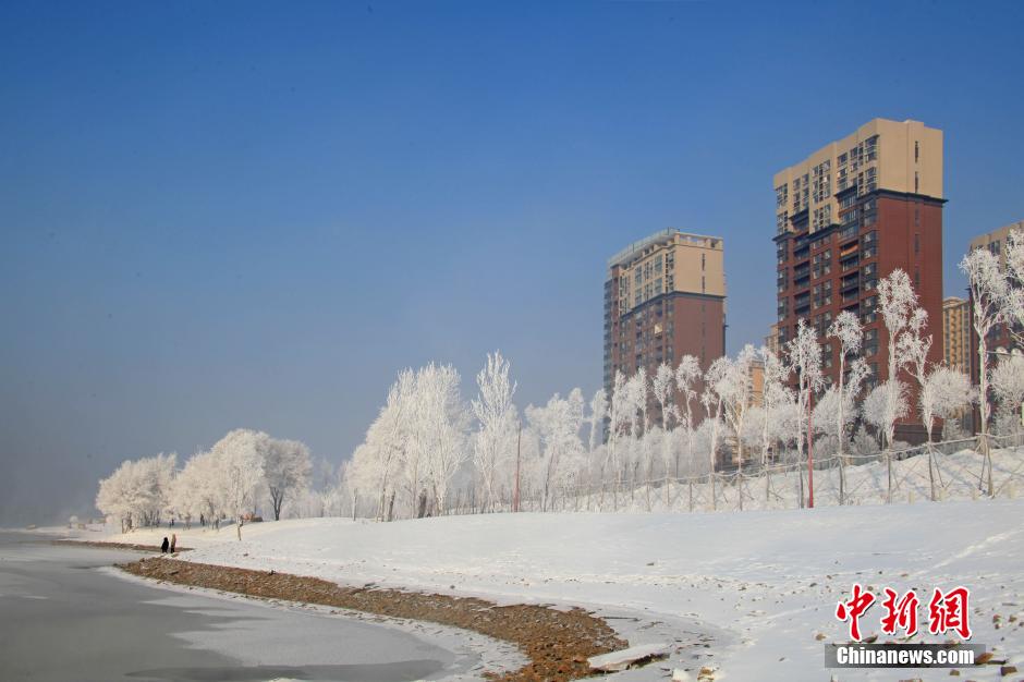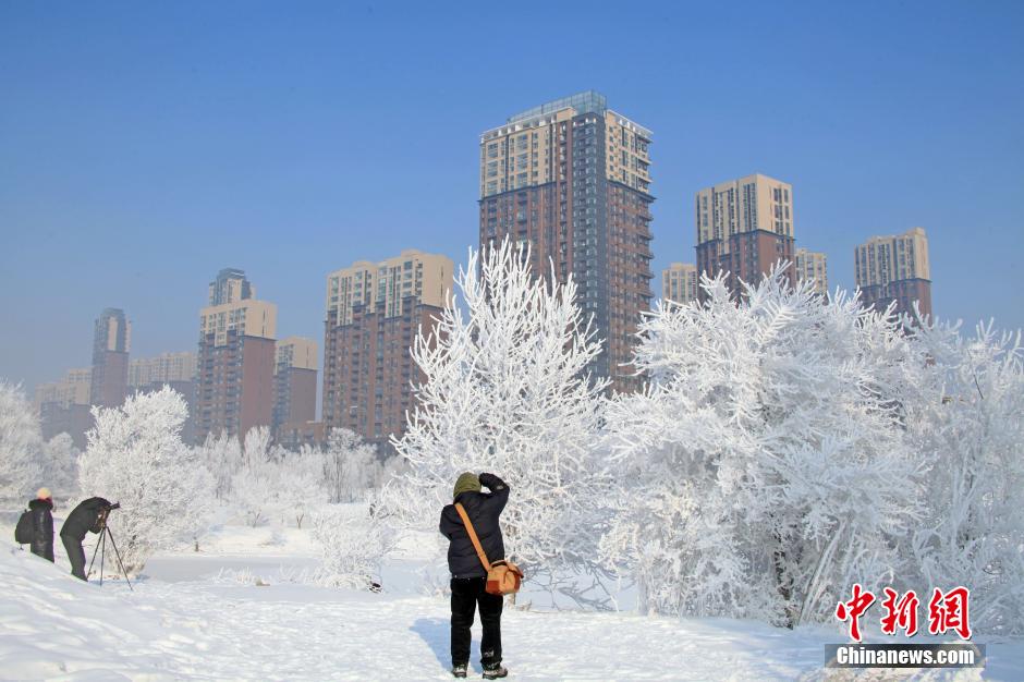 2014年1月21日,游客在吉林省吉林市松花江畔附近拍攝霧凇美景。吉林市2014年首場(chǎng)大雪后,松花江畔銀裝素裹,出現(xiàn)霧凇美景。中新社發(fā) 朱萬昌 攝 圖片來源:CNSPHOTO