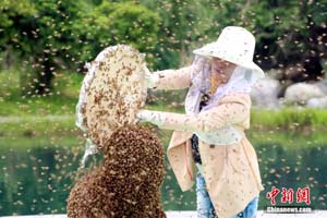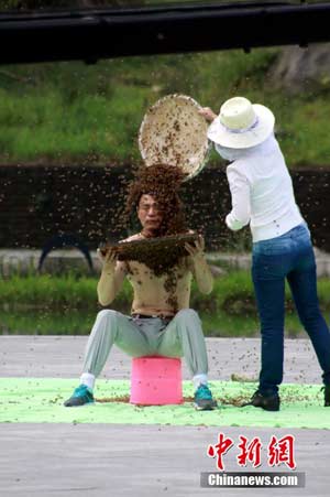 5月13日,“吉尼斯中國(guó)之夜”在江西宜春明月山明月廣場(chǎng)舉行。江西“第一蜂人”、宜春市奉新縣養(yǎng)蜂人阮良明挑戰(zhàn)“人體肩部以上布滿蜜蜂堅(jiān)持時(shí)間最長(zhǎng)”吉尼斯世界紀(jì)錄。最終,吉尼斯認(rèn)證官宣布,阮良明的人體肩部以上布滿蜜蜂堅(jiān)持時(shí)間為53分34秒,成功創(chuàng)造了吉尼斯世界紀(jì)錄。鄒海斌 攝