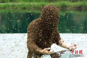 圖為江西“第一蜂人”阮良明靜坐挑戰(zhàn),上身已布滿密密麻麻的蜜蜂。鄒海斌 攝