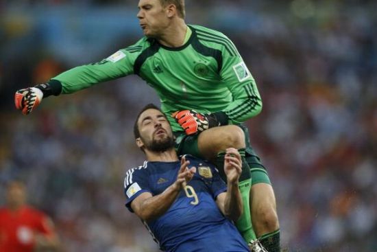 新浪體育訊 90分鐘阿根廷德國戰(zhàn)成0比0平,雖然沒有進(jìn)球,但是比賽沖突不斷,伊瓜因和諾伊爾發(fā)生沖撞,諾伊爾飛膝頂?shù)揭凉弦颉?/p>