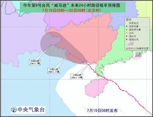 人民網(wǎng)北京7月18日電 中央氣象臺7月19日6時繼續(xù)發(fā)布臺風(fēng)紅色預(yù)警:今年第9號臺風(fēng)“威馬遜”(超強(qiáng)臺風(fēng)級)的中心已于18日19時30分前后在廣東省徐聞縣龍?zhí)伶?zhèn)沿海再次登陸,登陸時中心附近最大風(fēng)力仍有17級(60米/秒),中心最低氣壓為910百帕。今天早晨5點(diǎn)鐘“威馬遜”已減弱為強(qiáng)臺風(fēng)級,6點(diǎn)鐘其中心位于廣西防城港東南近海海面,就是北緯21.5度、東經(jīng)108.8度,中心附近最大風(fēng)力仍有15級(50米/秒),中心最低氣壓為945百帕。